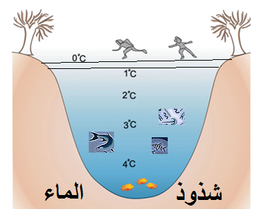 أصغر حجم وأكثر كثافة، لنفس الكتلة المائية يكون في درجة حرارة 4ْ مئوية ولذلك ترسب إلى الطبقات السفلية للمجمع المائي. عندما تبرد المياه أكثر يزداد حجمها فتقل كثافتها وترتفع نحو سطح المجمع المائي، وهنا تتجمد الطبقة العلوية من مياه المجمعات المائية أما الطبقات السفلية فتبقى في حالة السيولة وتبقى درجة حرارتها 4ْ مئوية طيلة فصل الشتاء.