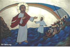 "وَفِي الرُّبْعِ الأَخِيرِ مِنَ اللَّيْلِ جَاءَ يَسُوعُ إِلَى التَّلاَمِيذِ مَاشِياً عَلَى مَاءِ الْبُحَيْرَةِ. فَلَمَّا رَآهُ التَّلاَمِيذُ مَاشِياً عَلَى الْمَاءِ، اضْطَرَبُوا قَائِلِينَ: "إِنَّهُ شَبَحٌ!" وَمِنْ خَوْفِهِمْ صَرَخُوا. وَفِي الْحَالِ كَلَّمَهُمْ يَسُوعُ قَائِلاً: "تَشَجَّعُوا! أَنَا هُوَ. لاَ تَخَافُوا!" (متى 14)